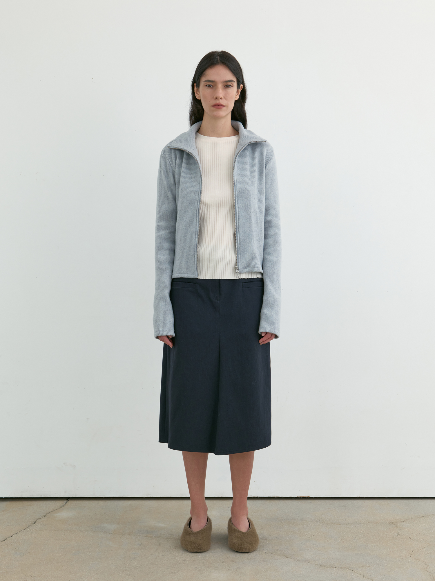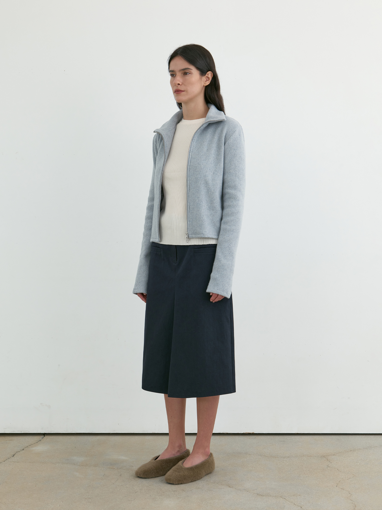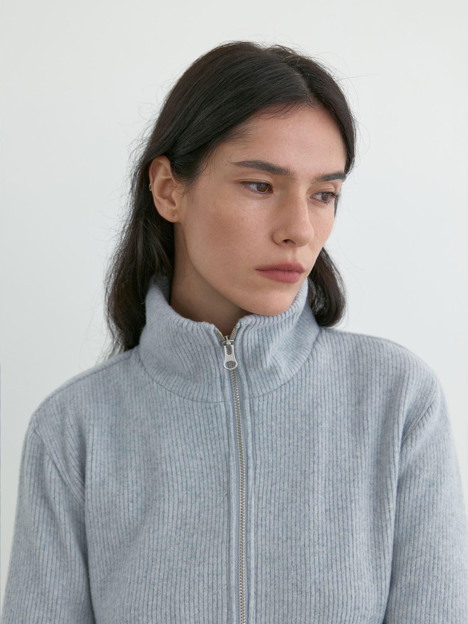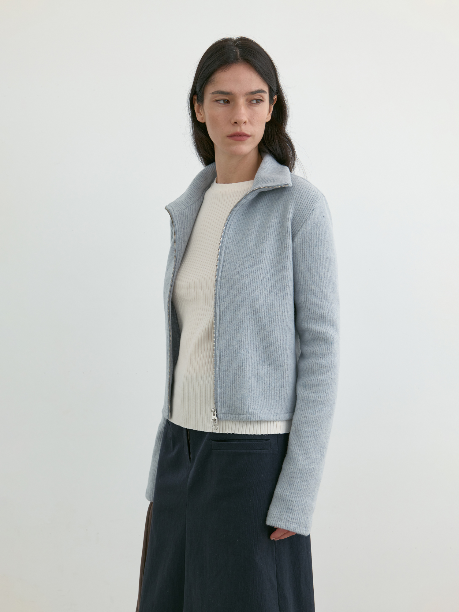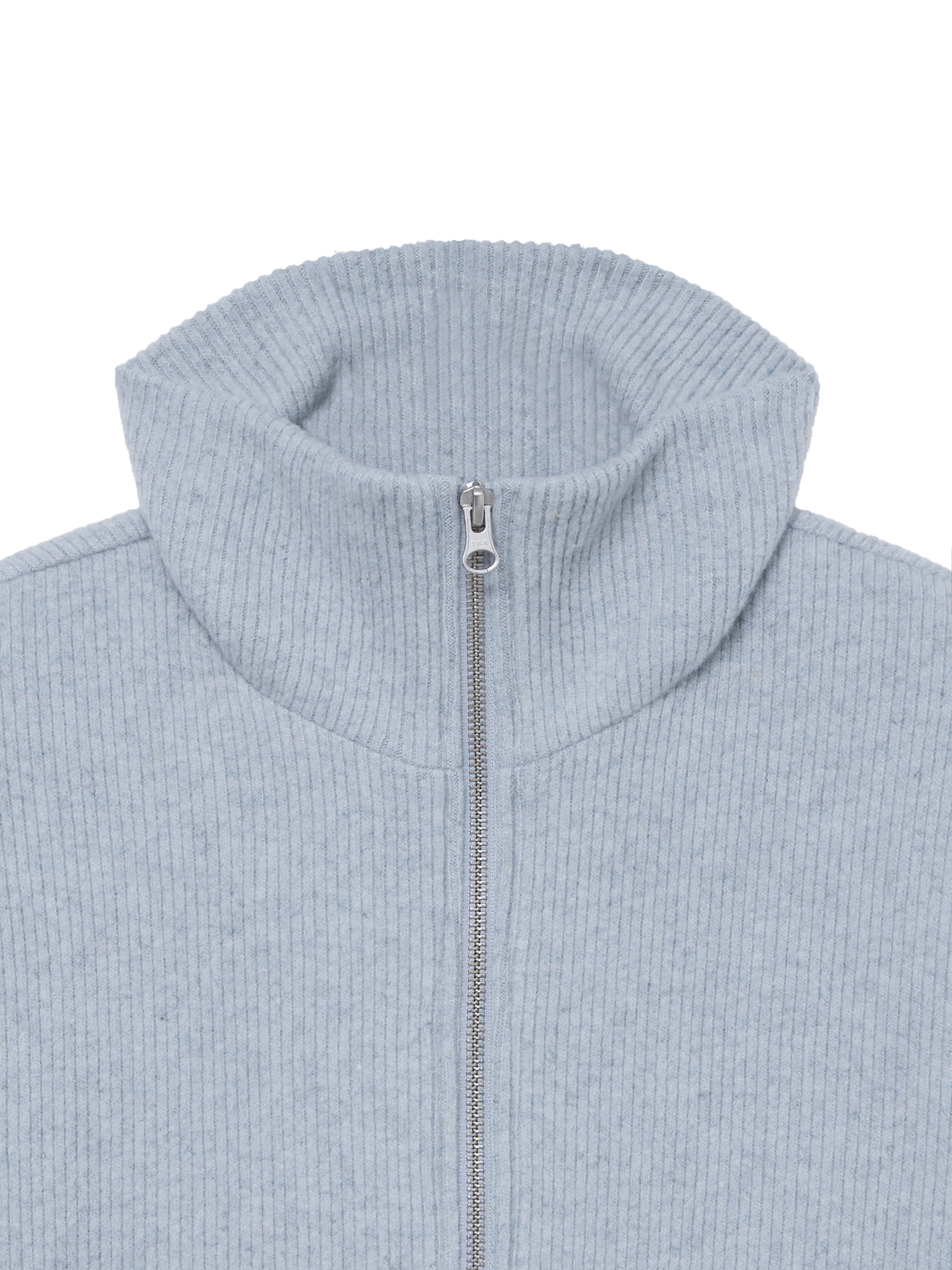 부드러운 기모감이 느껴지는 리브 니트로 제작된 집업 탑입니다. 울 혼방 소재 특유의 따뜻하고 포근한 터치가 돋보이며, 목 끝까지 이어지는 하이넥 지퍼 디자인으로 단정하게 마무리됩니다. 중간 두께의 유연한 니트로 부드럽게 떨어지며, 단독으로 착용해도 편안하고 자연스러우며, 겨울철 이너로도 포근한 무드를 이어줍니다. 은은하게 톤 다운된 페일 블루 컬러가 차분하면서도 부드러운 인상을 완성합니다. |