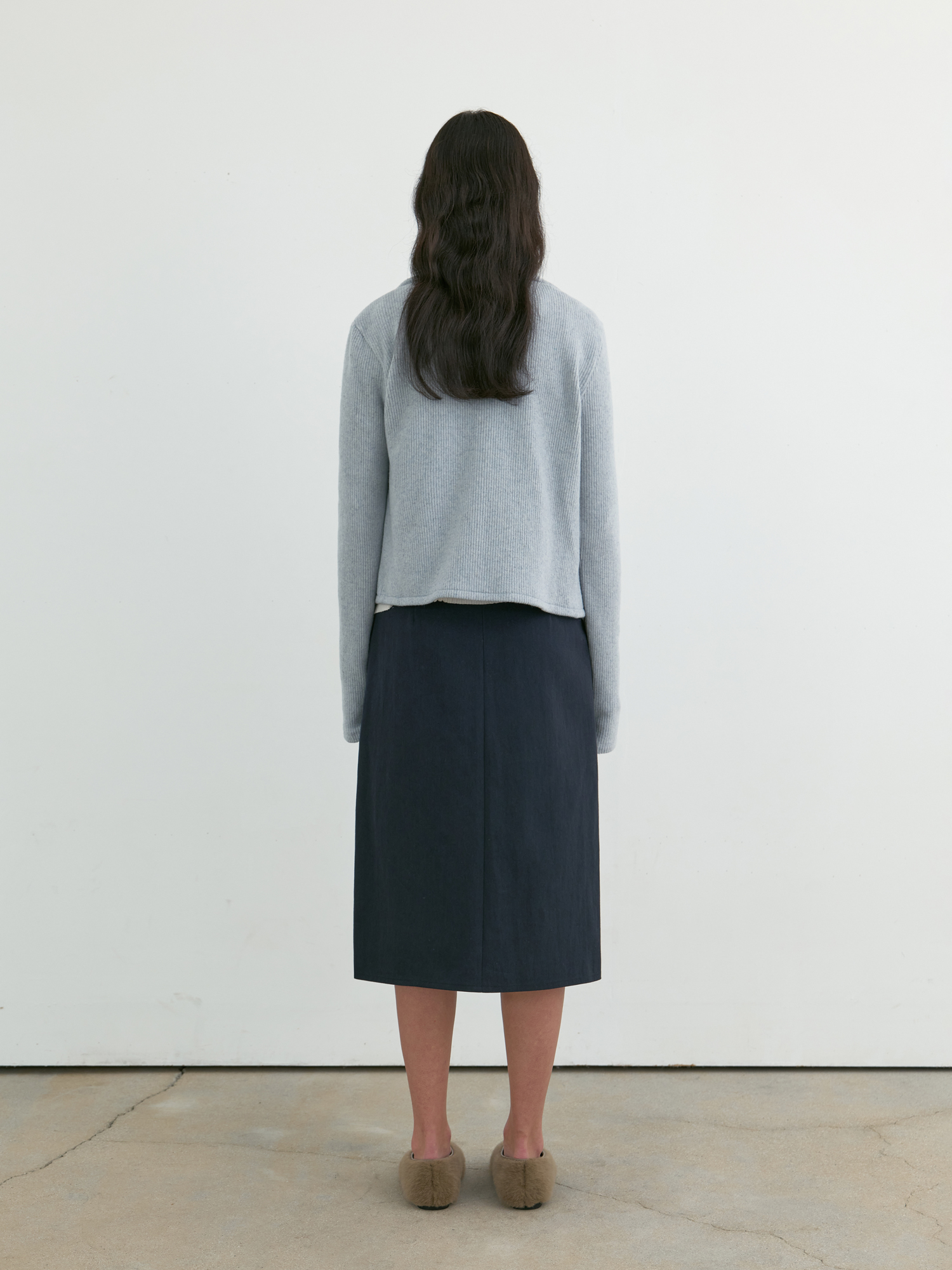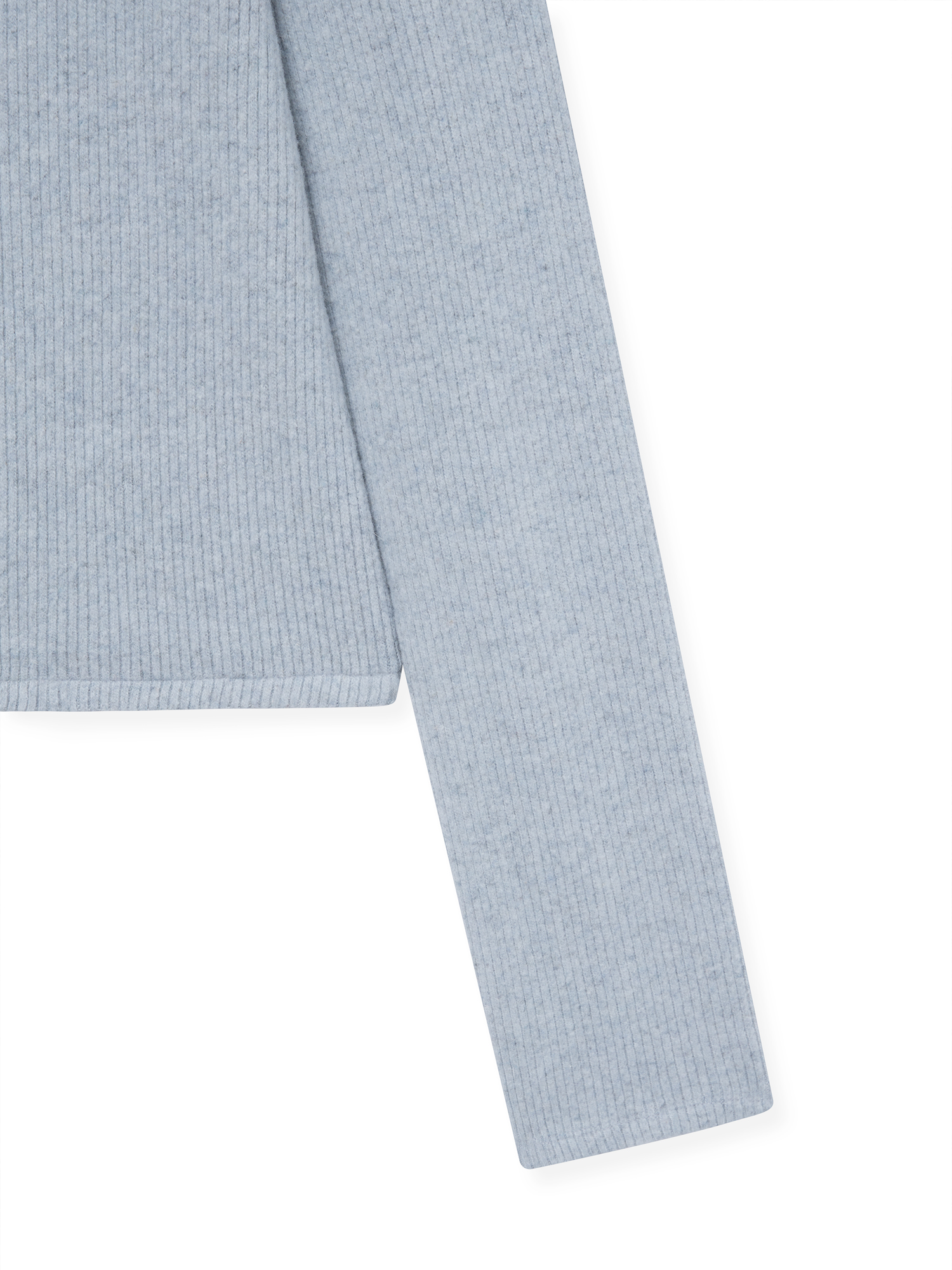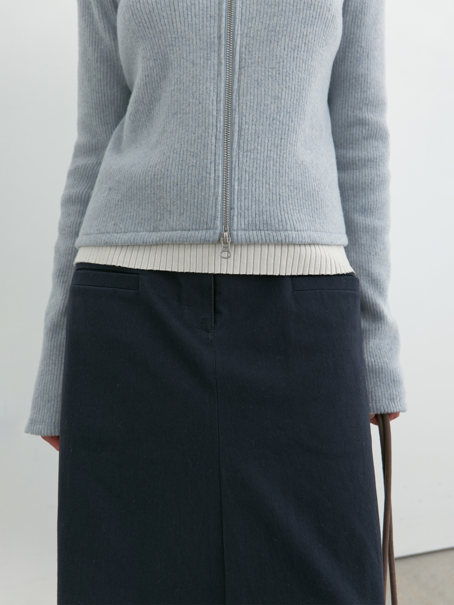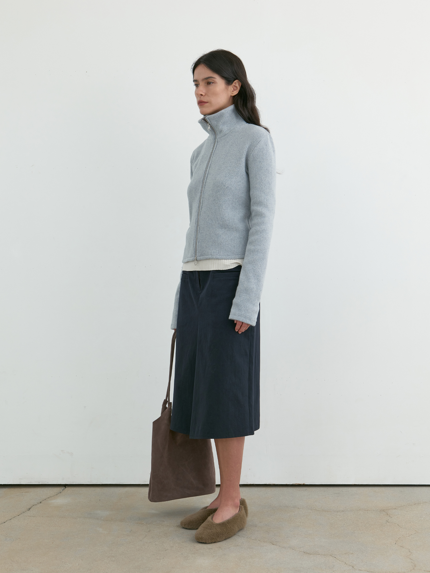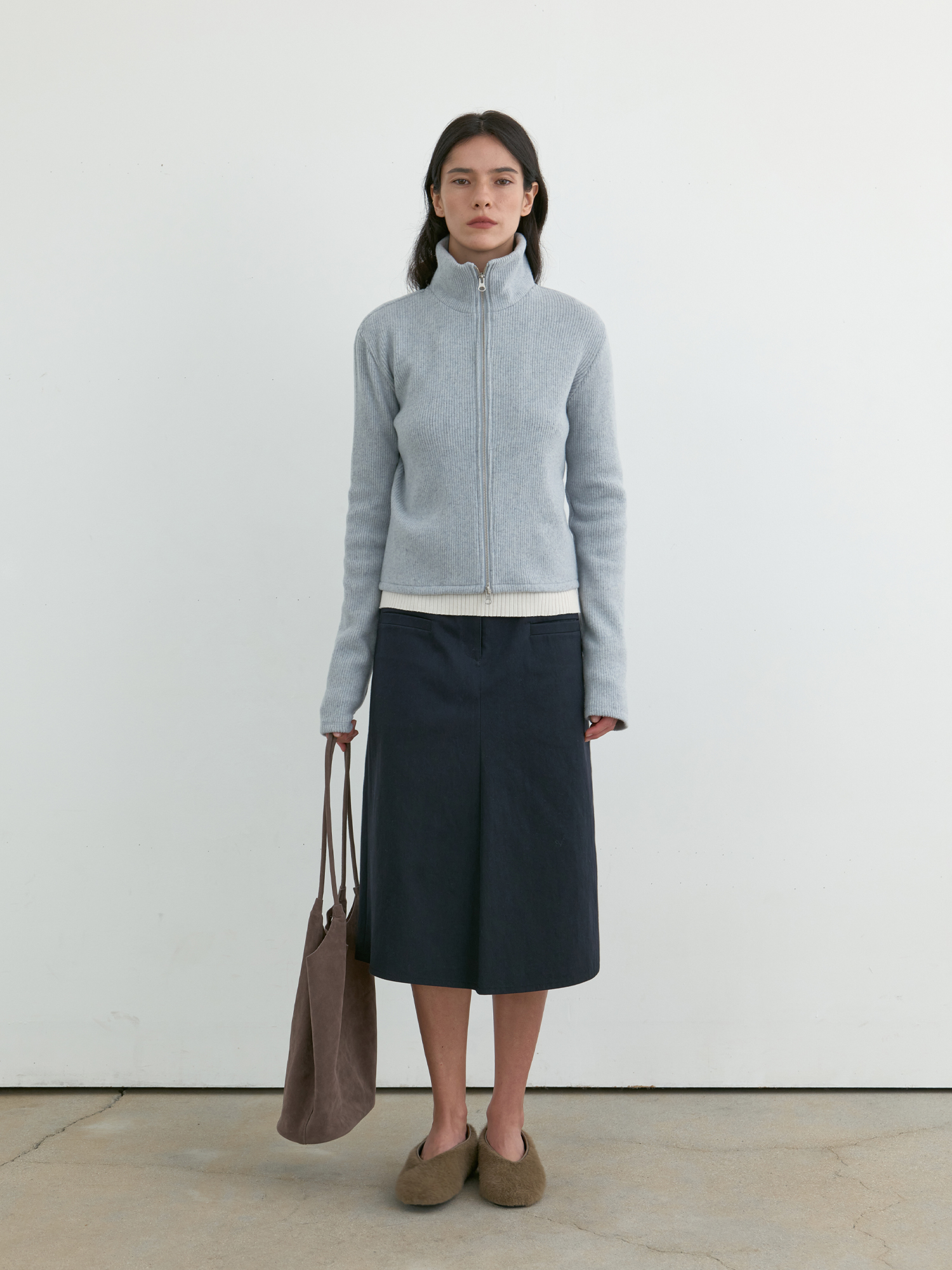 부드러운 기모감이 느껴지는 리브 니트로 제작된 집업 탑입니다. 울 혼방 소재 특유의 따뜻하고 포근한 터치가 돋보이며, 목 끝까지 이어지는 하이넥 지퍼 디자인으로 단정하게 마무리됩니다. 중간 두께의 유연한 니트로 부드럽게 떨어지며, 단독으로 착용해도 편안하고 자연스러우며, 겨울철 이너로도 포근한 무드를 이어줍니다. 은은하게 톤 다운된 페일 블루 컬러가 차분하면서도 부드러운 인상을 완성합니다. |