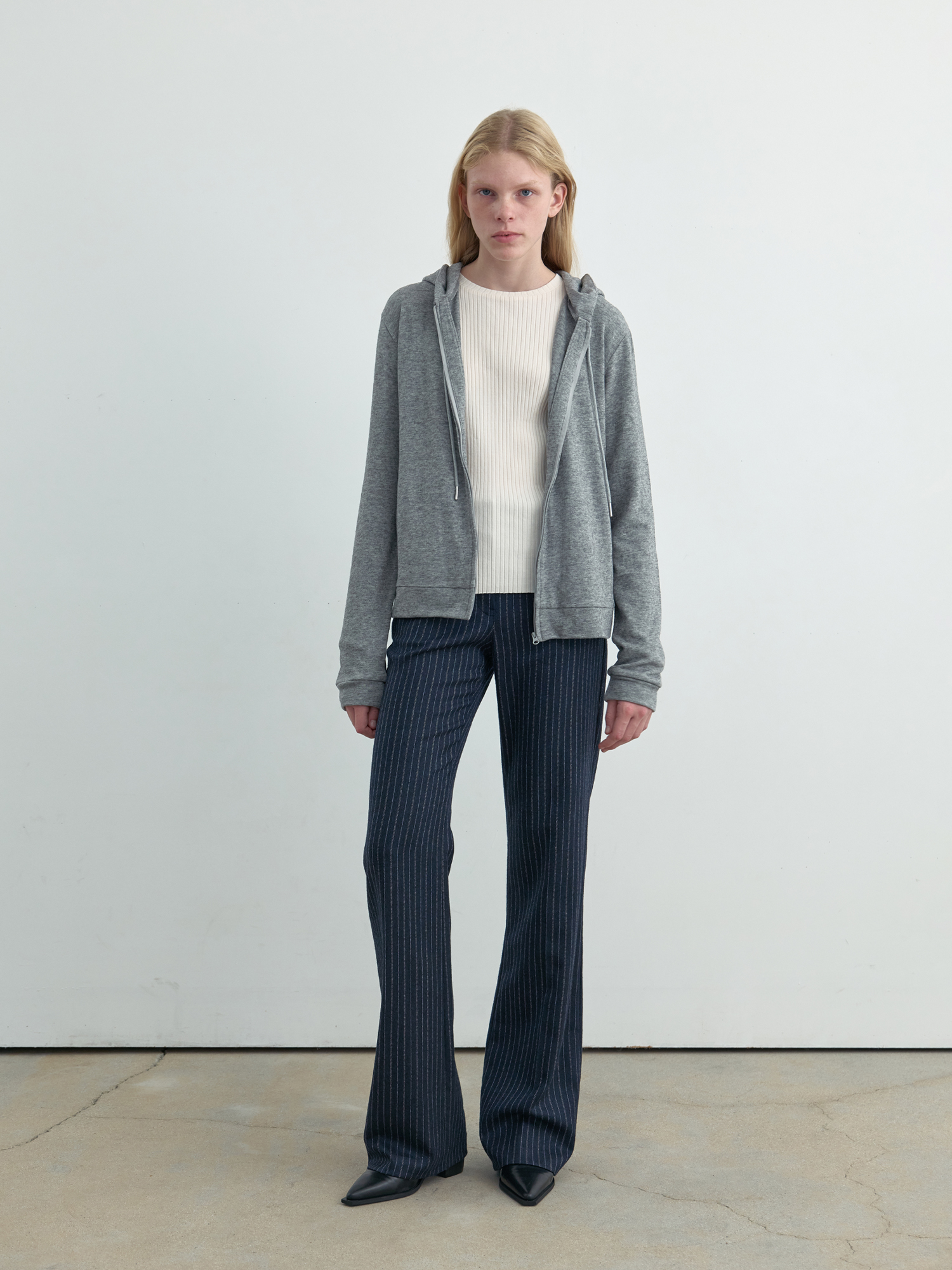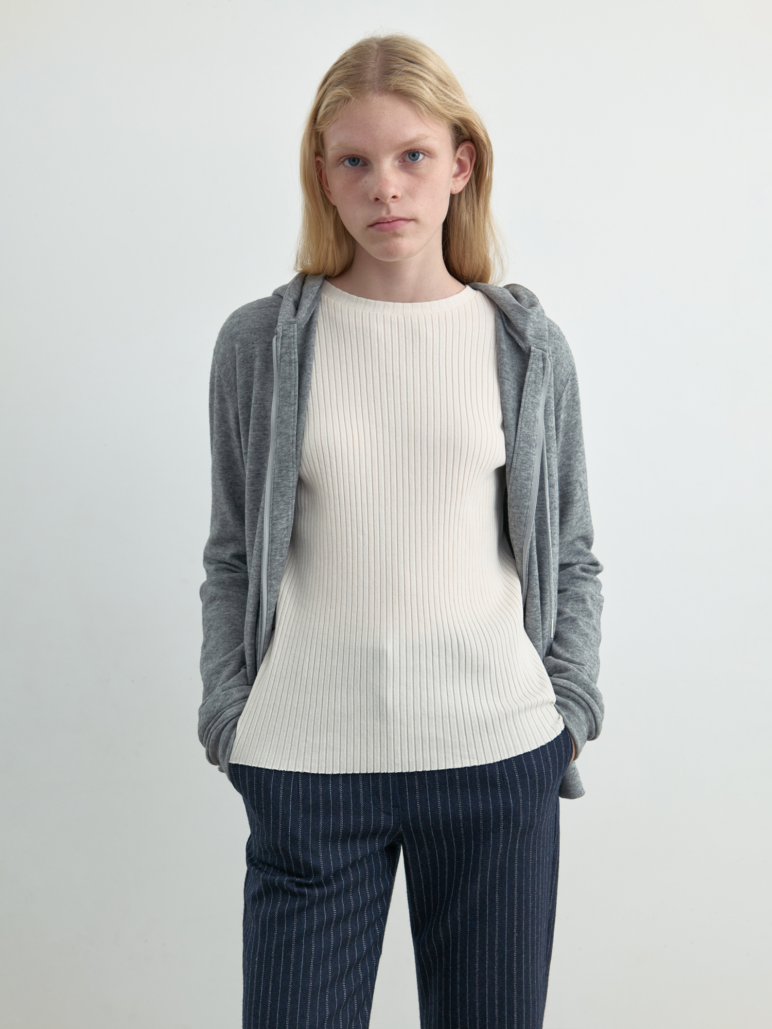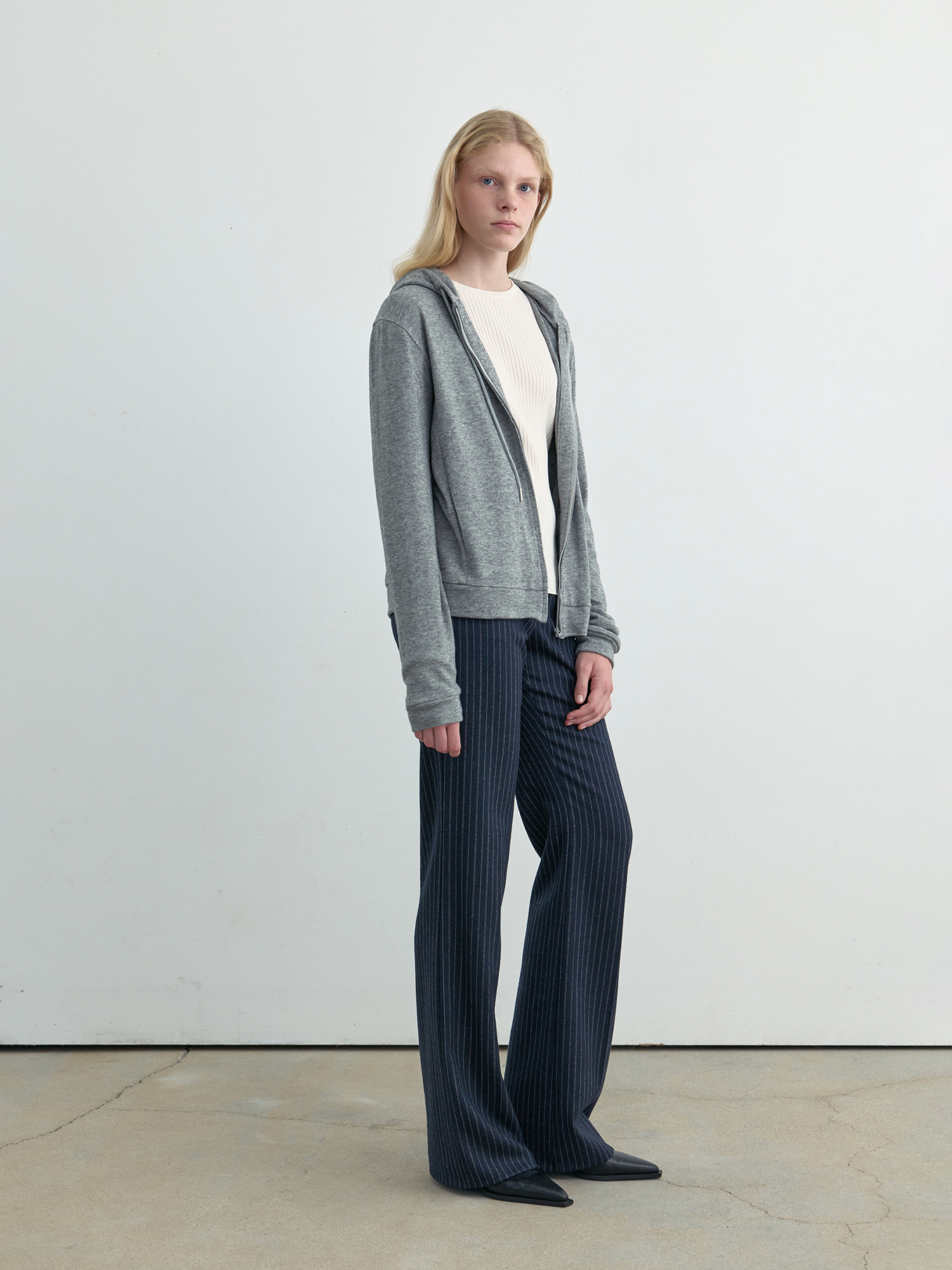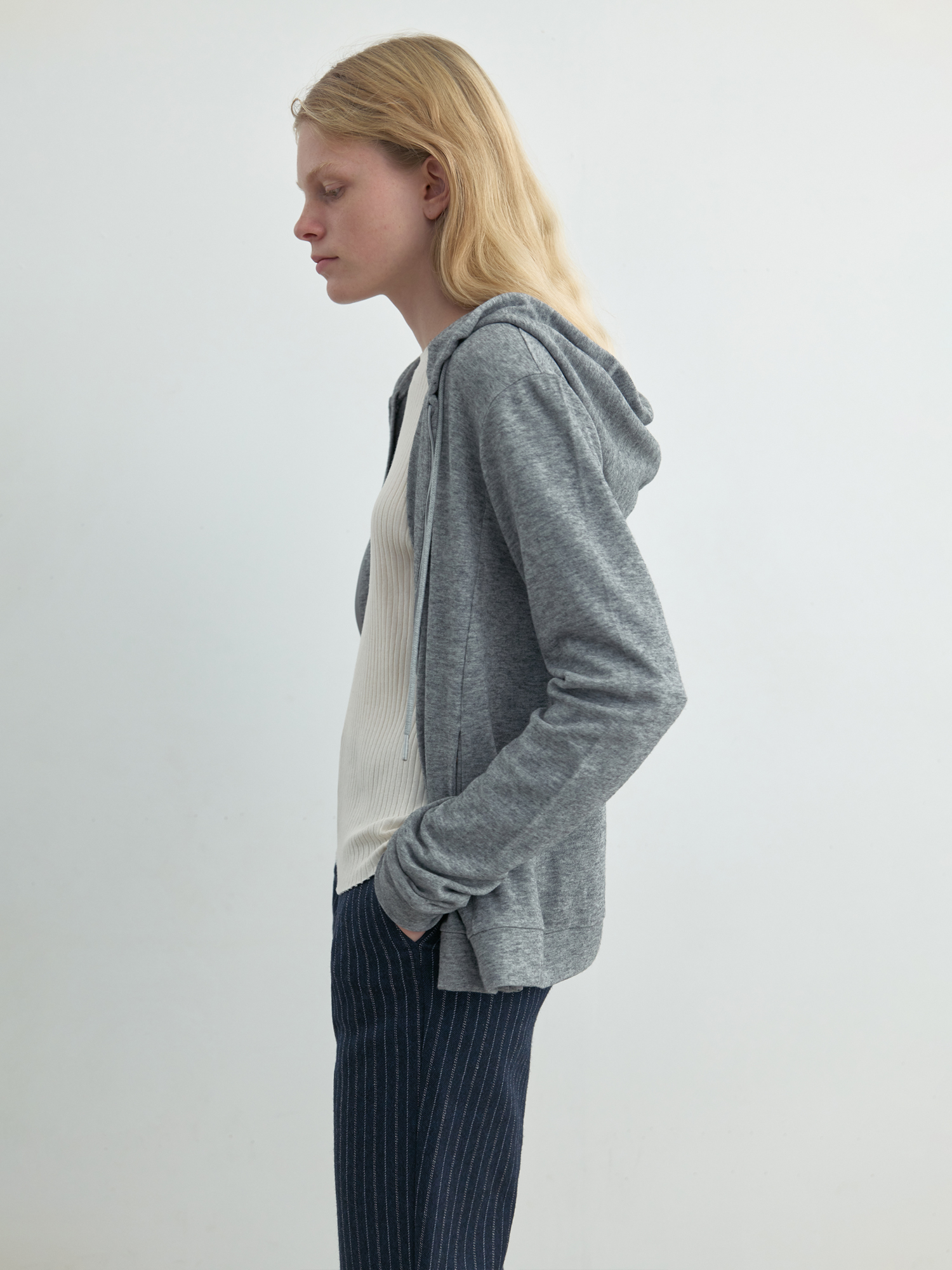 울·아크릴·앙고라 혼방의 니트 져지 소재로 제작된 멜란지 그레이 후드 집업입니다. 가볍고 유연한 조직감이 편안한 착용감을 주며, 두 겹으로 마감된 후드는 자연스럽게 형태를 잡아줍니다. 히든 지퍼 여밈으로 단정하게 마무리되며, 리브 없이 처리된 밑단과 소매단이 담백한 실루엣을 완성합니다. 중간톤의 멜란지 그레이 컬러가 차분하고 부드러운 무드를 더하며, 셋업 팬츠와 함께하거나 단독으로도 자연스럽게 어울립니다. |