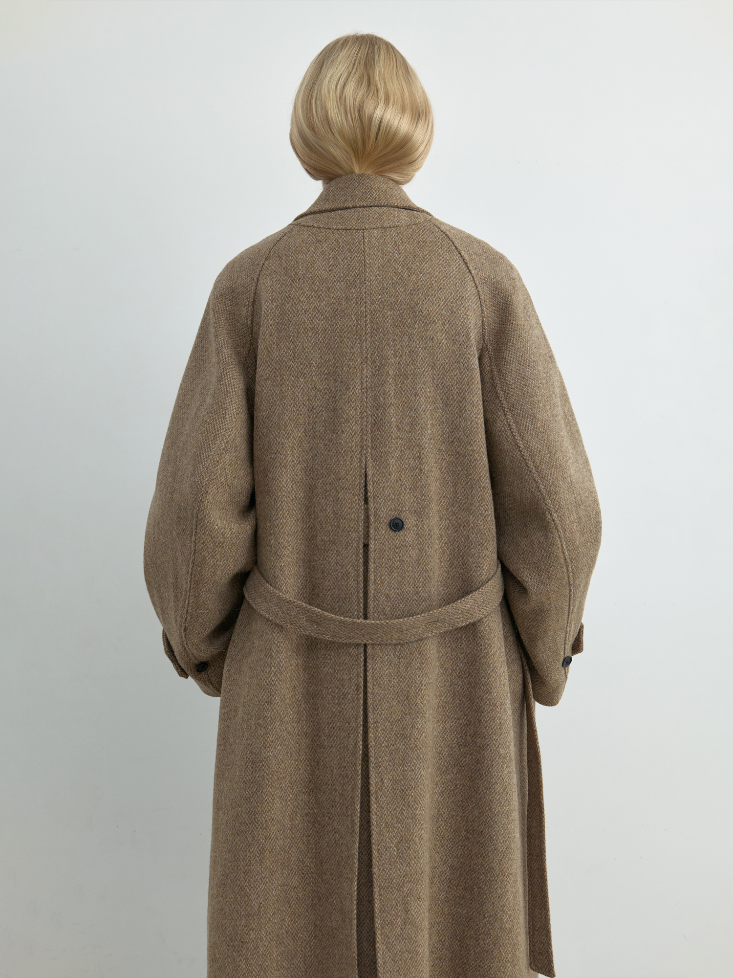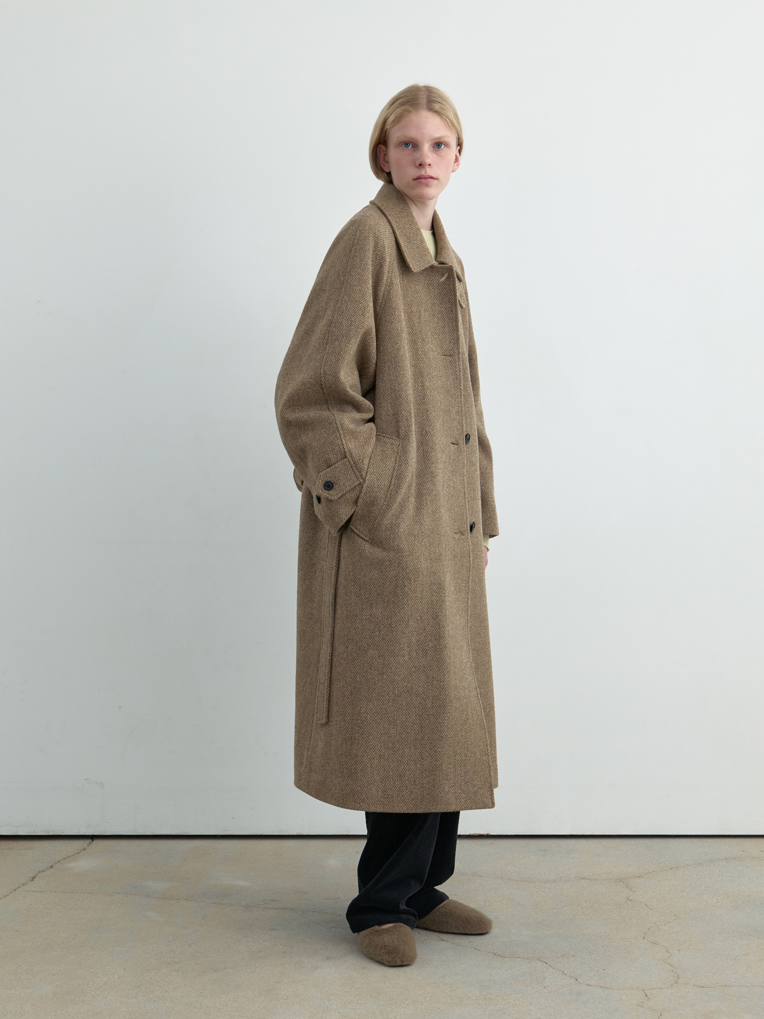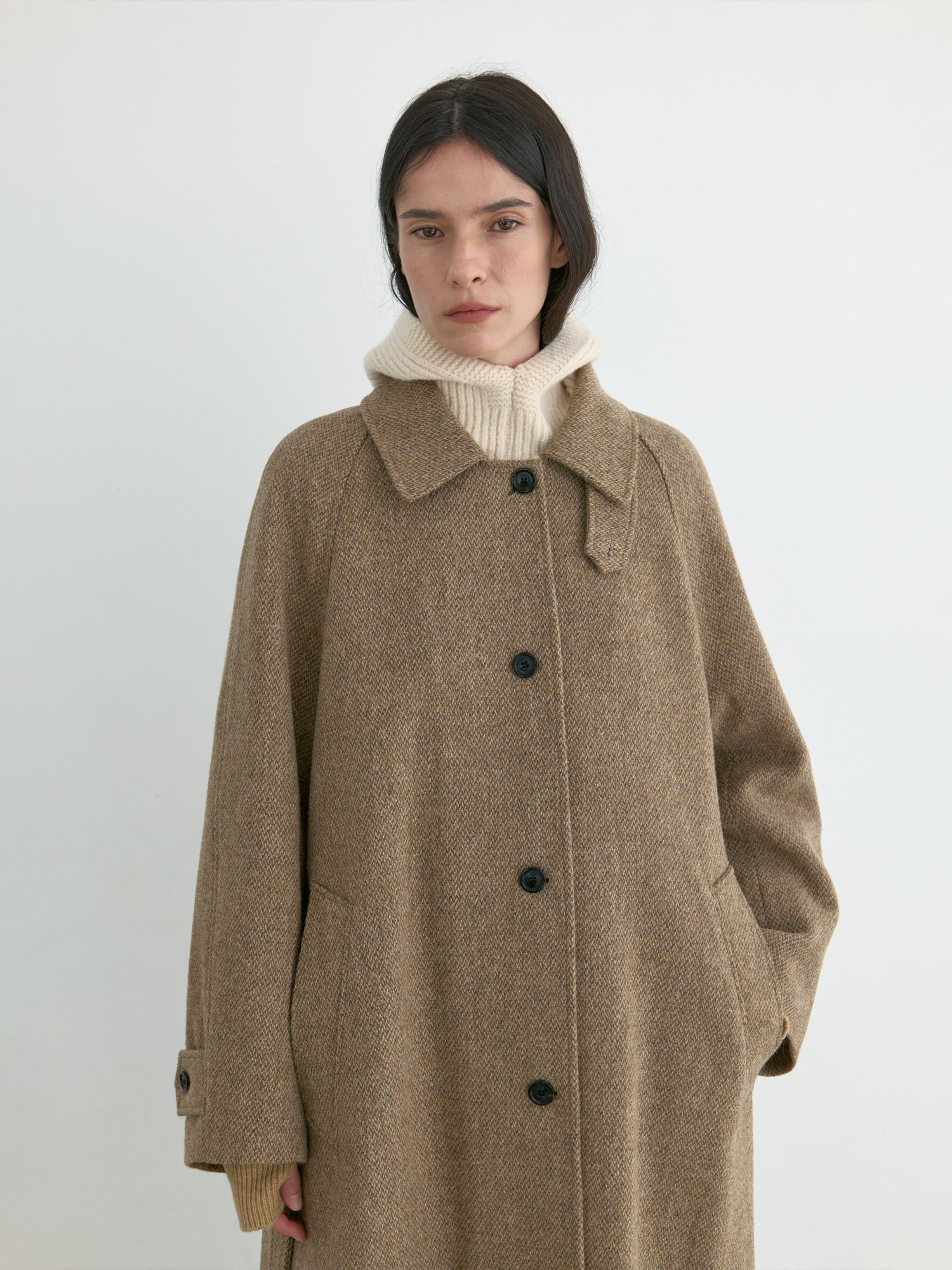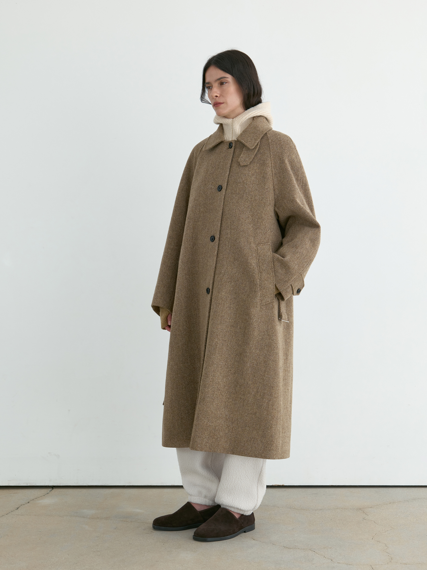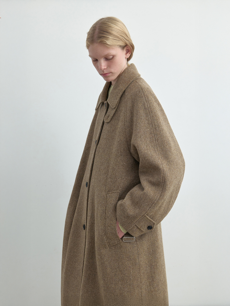 자연스럽게 퍼지는 세미 A라인 실루엣의 롱 코트입니다. 종아리를 안정적으로 덮는 기장감과 여유 있는 목 파임, 입체적인 곡선의 소매 볼륨이 우아한 라인을 형성합니다. 뒤 중심의 미니멀한 브랜치 디테일과 둥글게 설계된 백넥 절개가 정돈된 구조감을 주며, 고정 및 히든 연출이 모두 가능합니다. 세 가지 소재 컬러 구성으로, 각기 다른 텍스처와 보온 밸런스를 갖춘 윈터 아우터입니다. -------------------------- 알파카 20%·울 80%의 트위드 텍스처가 돋보이는 카멜 버전입니다. 원단 조직감을 보완하기 위해 기모 처리된 안감을 더해 보온성을 높였습니다. 부드럽게 섞인 멜란지 카멜 컬러가 자연스럽고 깊이 있는 겨울 톤을 연출하며, 차가운 계절에 포근하게 감싸주는 안정적인 코트입니다.