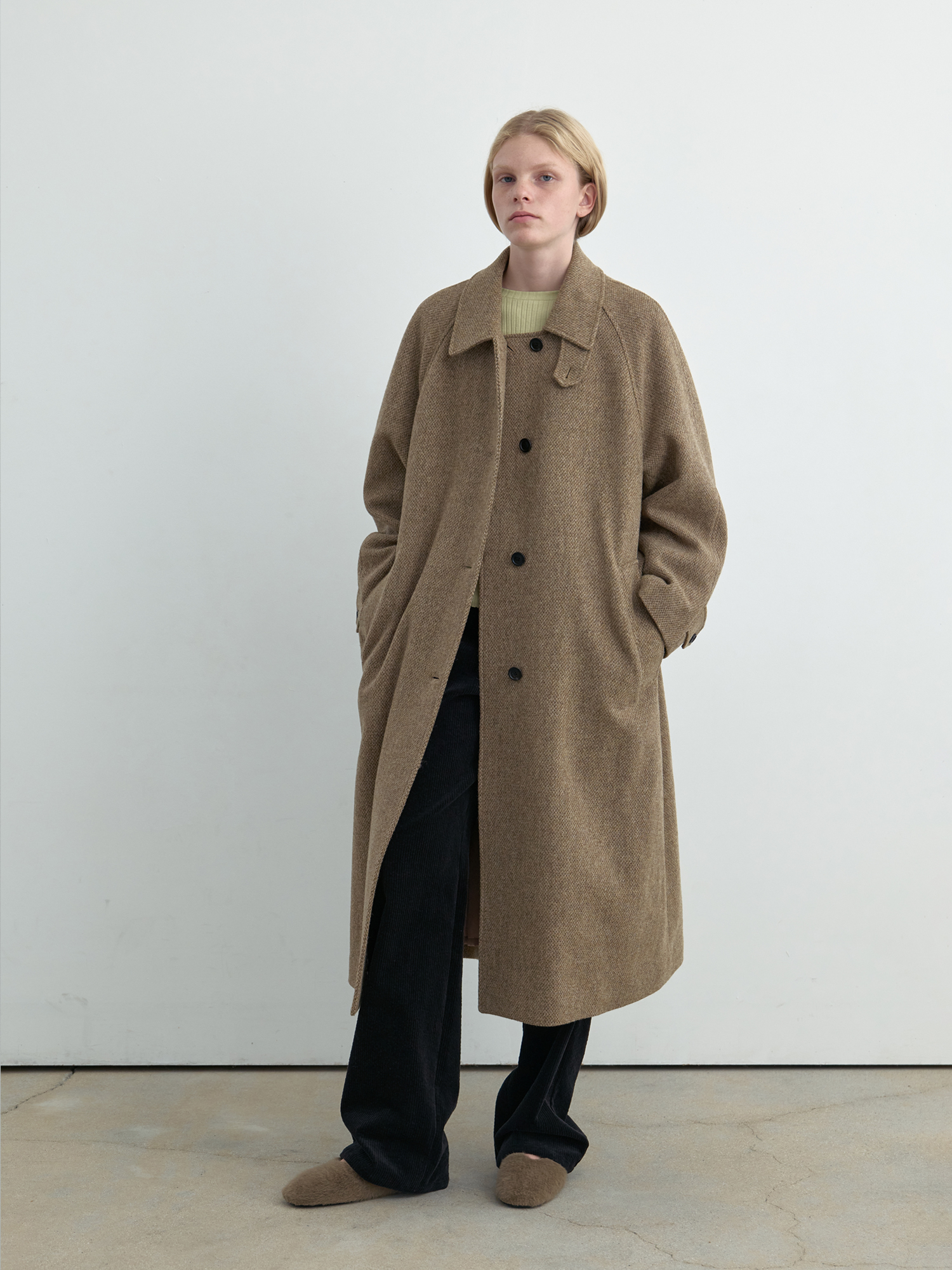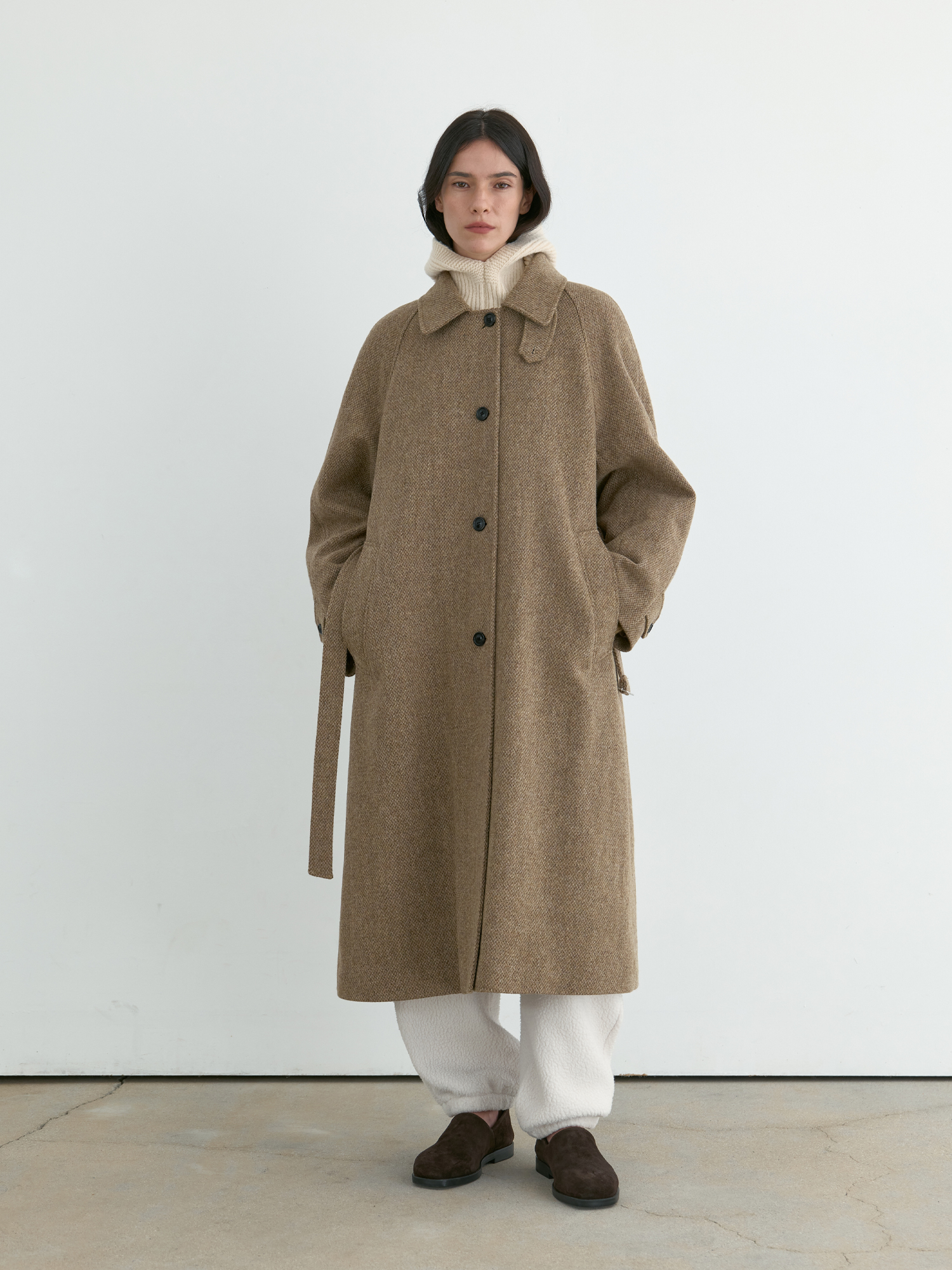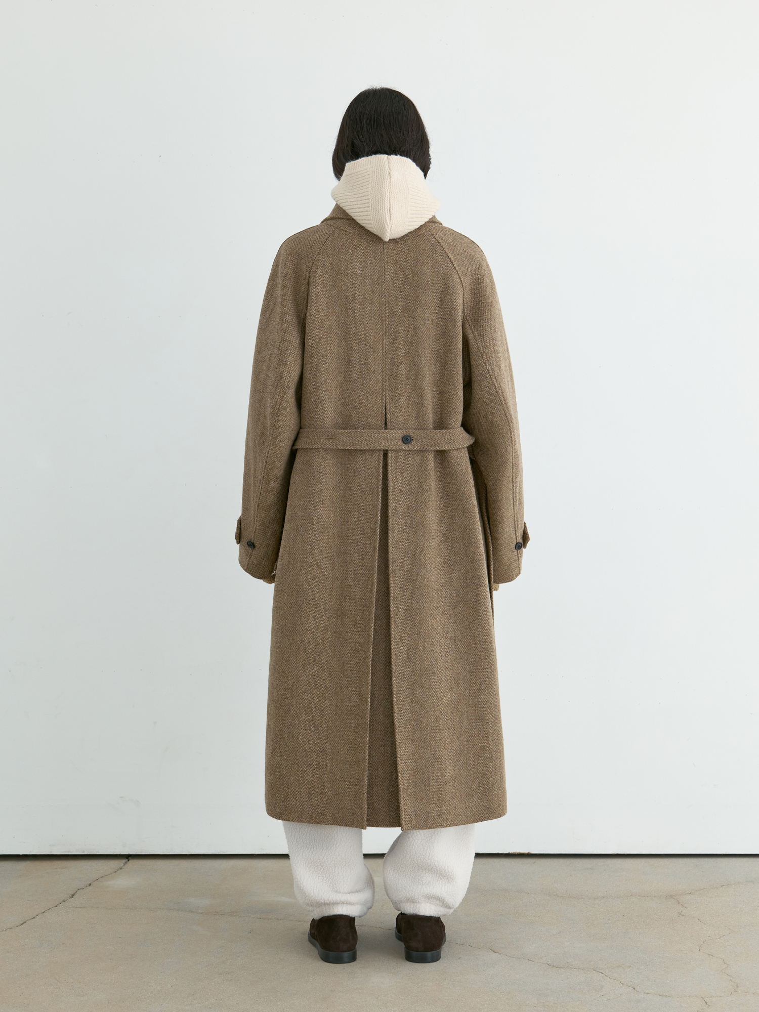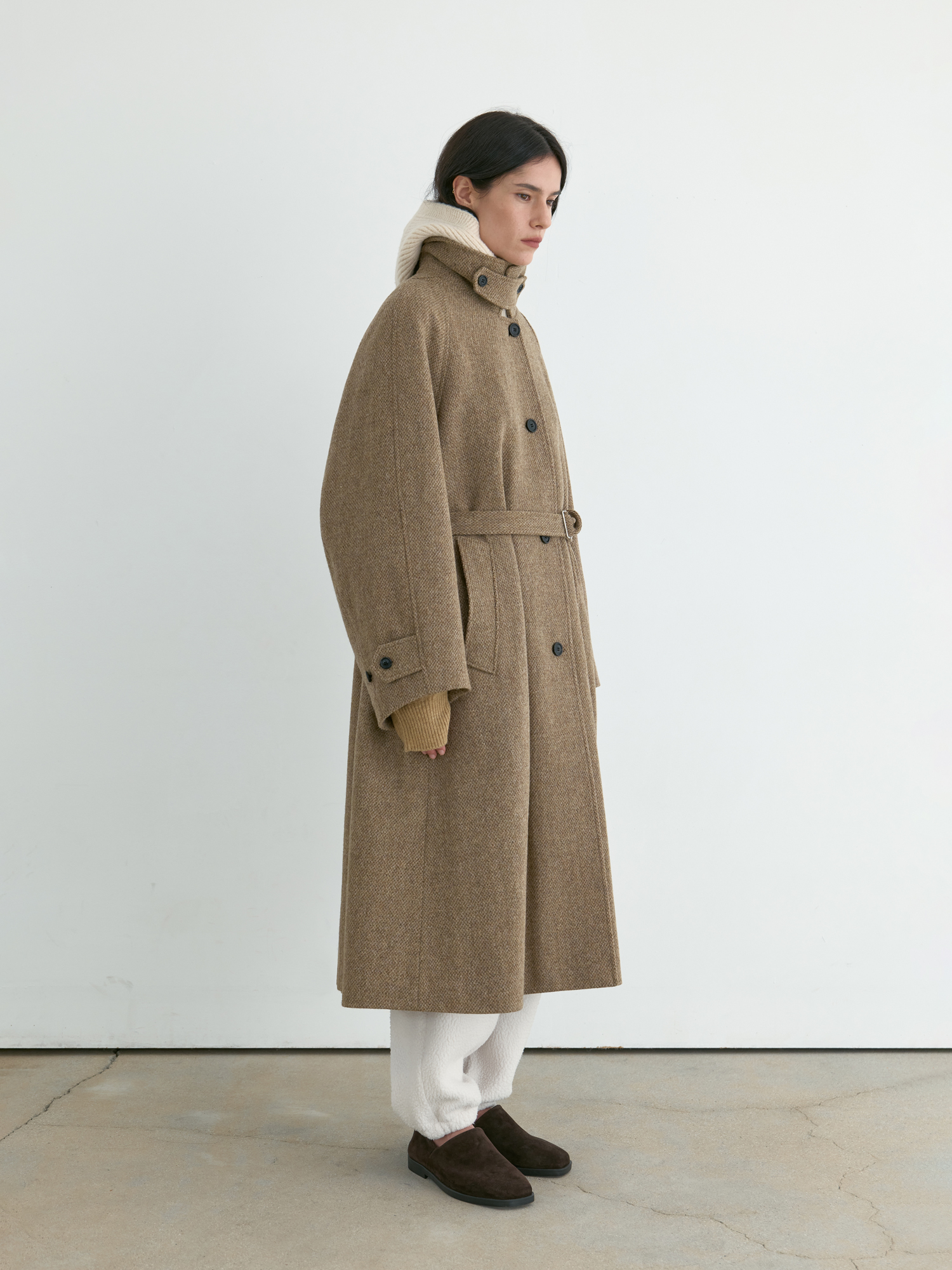 자연스럽게 퍼지는 세미 A라인 실루엣의 롱 코트입니다. 종아리를 안정적으로 덮는 기장감과 여유 있는 목 파임, 입체적인 곡선의 소매 볼륨이 우아한 라인을 형성합니다. 뒤 중심의 미니멀한 브랜치 디테일과 둥글게 설계된 백넥 절개가 정돈된 구조감을 주며, 고정 및 히든 연출이 모두 가능합니다. 세 가지 소재 컬러 구성으로, 각기 다른 텍스처와 보온 밸런스를 갖춘 윈터 아우터입니다. -------------------------- 알파카 20%·울 80%의 트위드 텍스처가 돋보이는 카멜 버전입니다. 원단 조직감을 보완하기 위해 기모 처리된 안감을 더해 보온성을 높였습니다. 부드럽게 섞인 멜란지 카멜 컬러가 자연스럽고 깊이 있는 겨울 톤을 연출하며, 차가운 계절에 포근하게 감싸주는 안정적인 코트입니다.