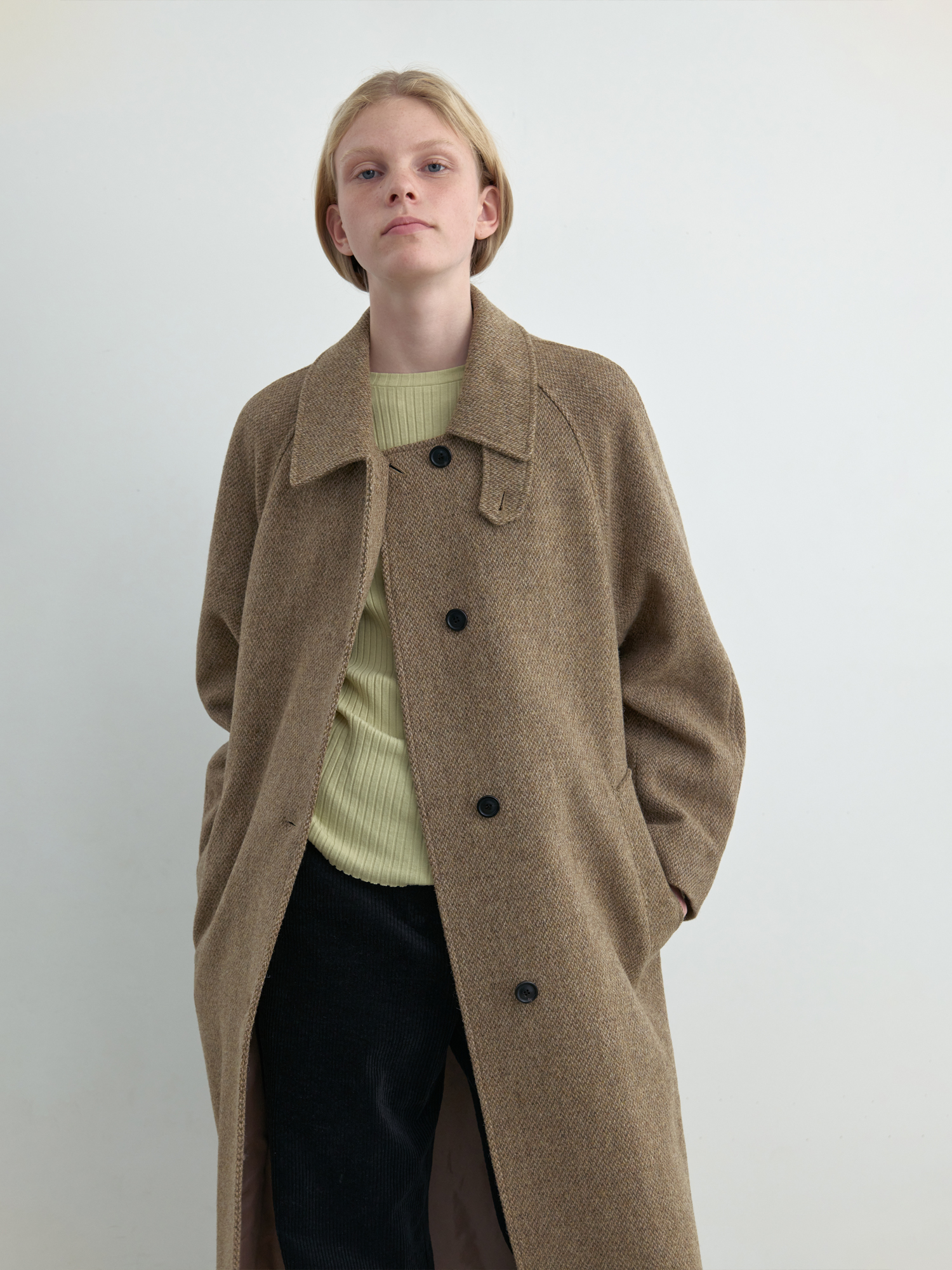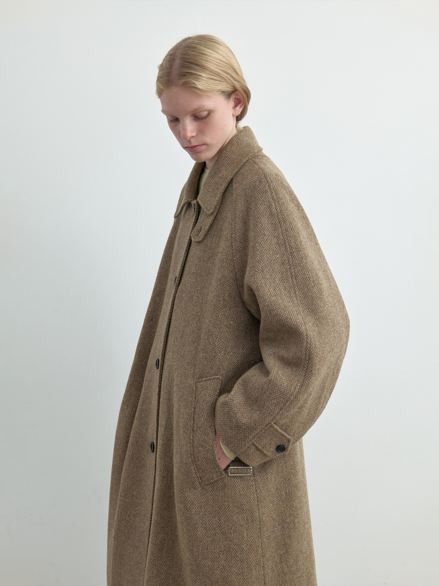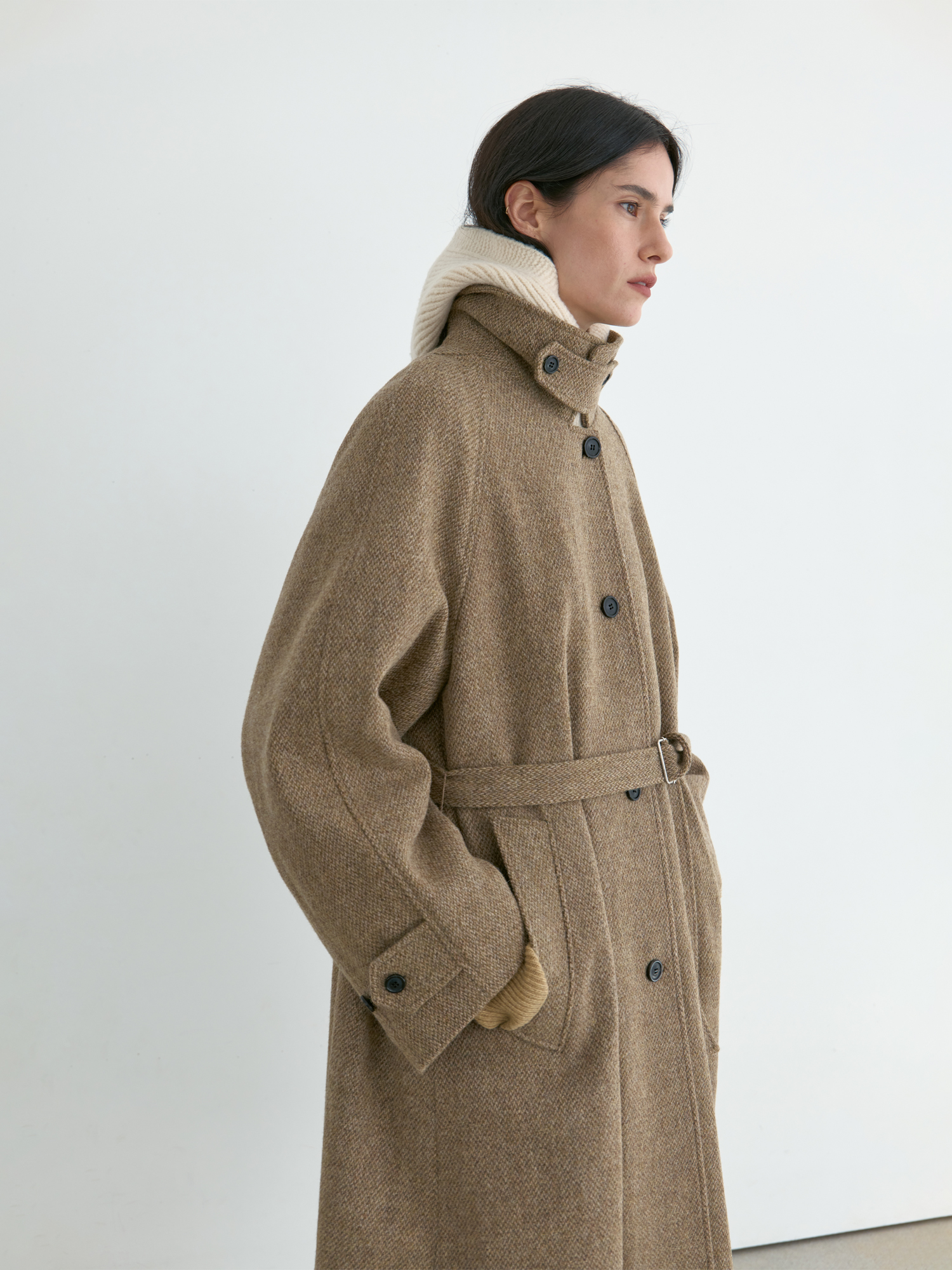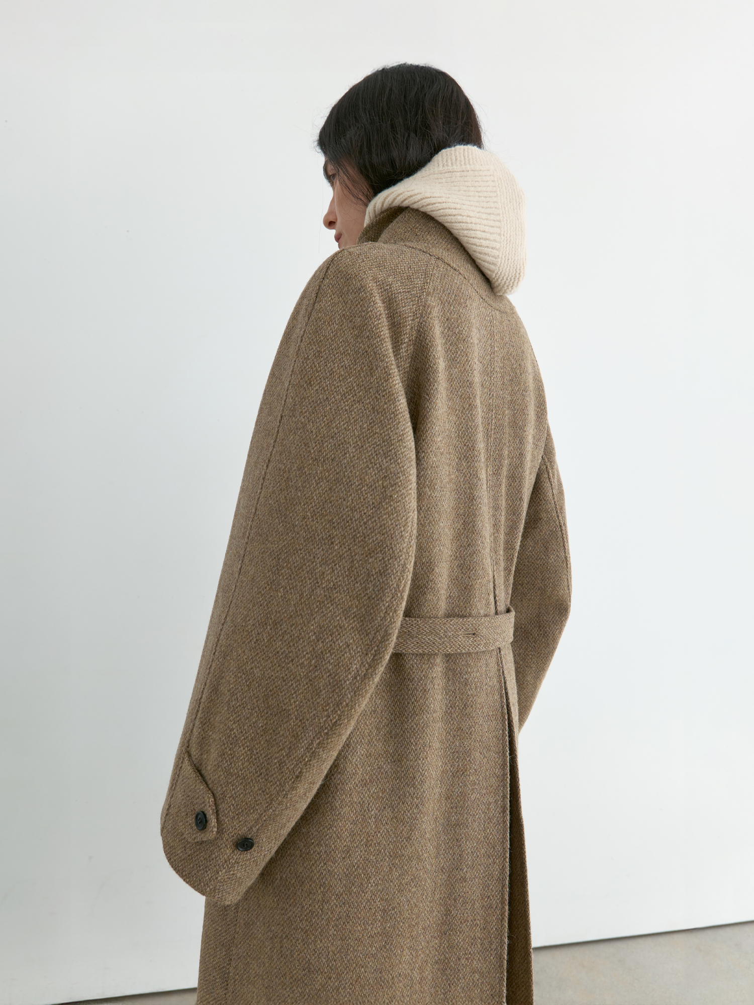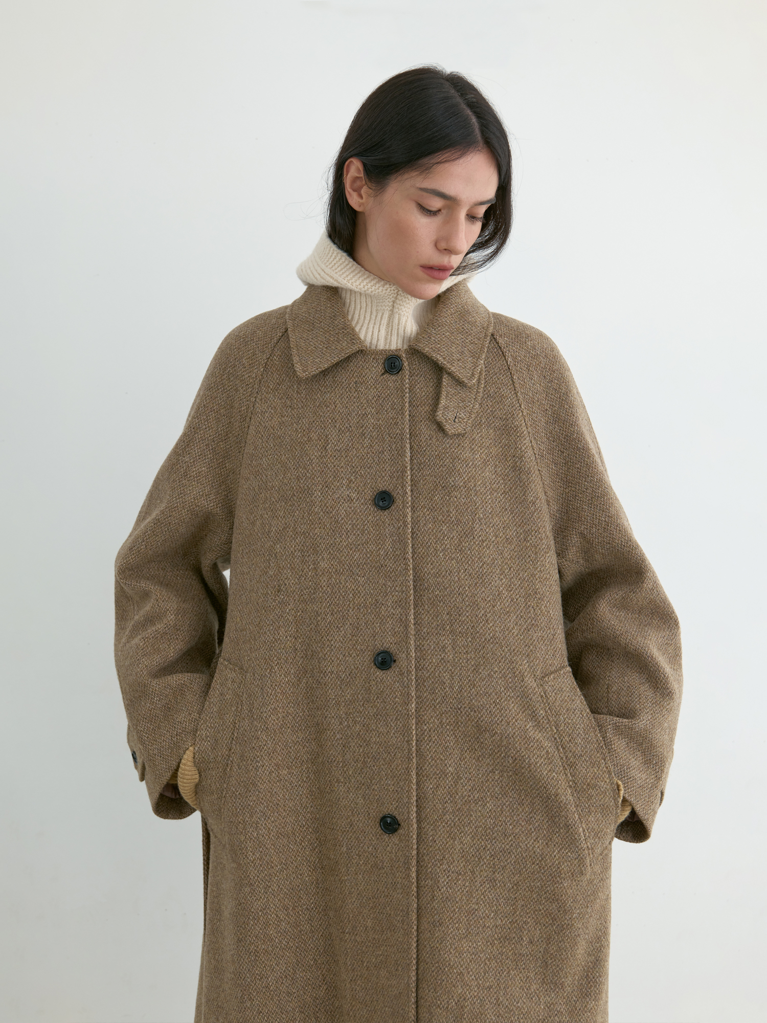 자연스럽게 퍼지는 세미 A라인 실루엣의 롱 코트입니다. 종아리를 안정적으로 덮는 기장감과 여유 있는 목 파임, 입체적인 곡선의 소매 볼륨이 우아한 라인을 형성합니다. 뒤 중심의 미니멀한 브랜치 디테일과 둥글게 설계된 백넥 절개가 정돈된 구조감을 주며, 고정 및 히든 연출이 모두 가능합니다. 세 가지 소재 컬러 구성으로, 각기 다른 텍스처와 보온 밸런스를 갖춘 윈터 아우터입니다. -------------------------- 알파카 20%·울 80%의 트위드 텍스처가 돋보이는 카멜 버전입니다. 원단 조직감을 보완하기 위해 기모 처리된 안감을 더해 보온성을 높였습니다. 부드럽게 섞인 멜란지 카멜 컬러가 자연스럽고 깊이 있는 겨울 톤을 연출하며, 차가운 계절에 포근하게 감싸주는 안정적인 코트입니다.