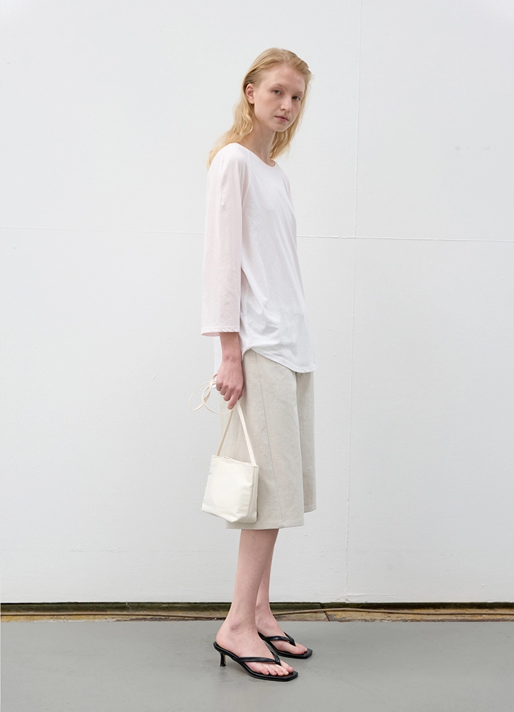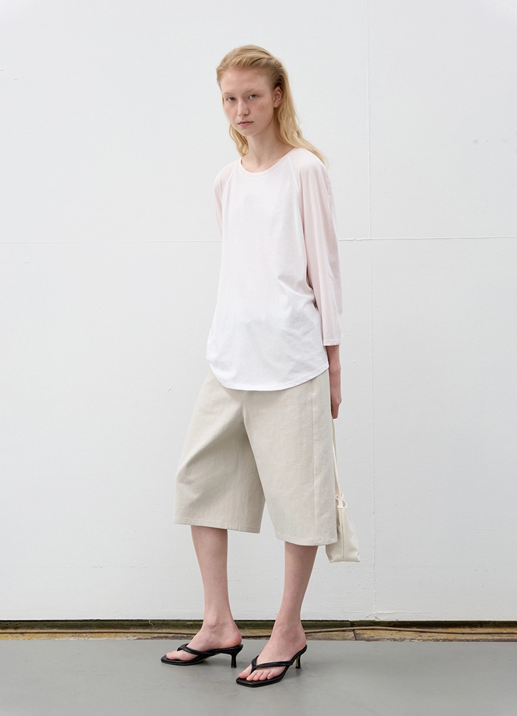 얇고 보드라운 난스판 져지로 완성한 7부 소매의 루스한 래글런 티셔츠입니다. 힙을 덮는 기장감으로 편하게 떨어지며, 여름까지 가볍게 입기 좋습니다. 몸판과 소매, 넥 립의 배색이 은은한 포인트가 되며, 라이트 핑크 톤이 부드러운 인상을 더합니다. |