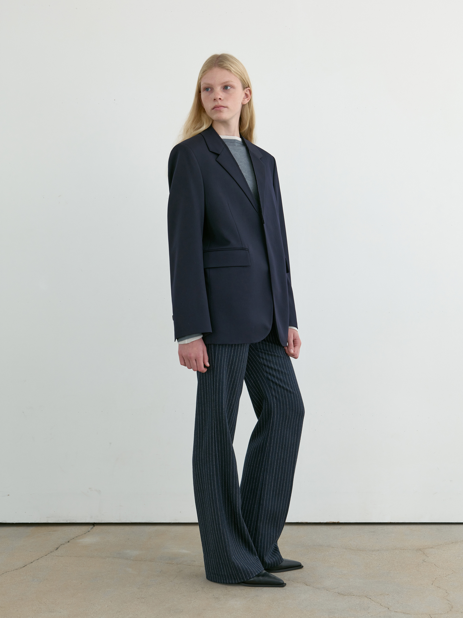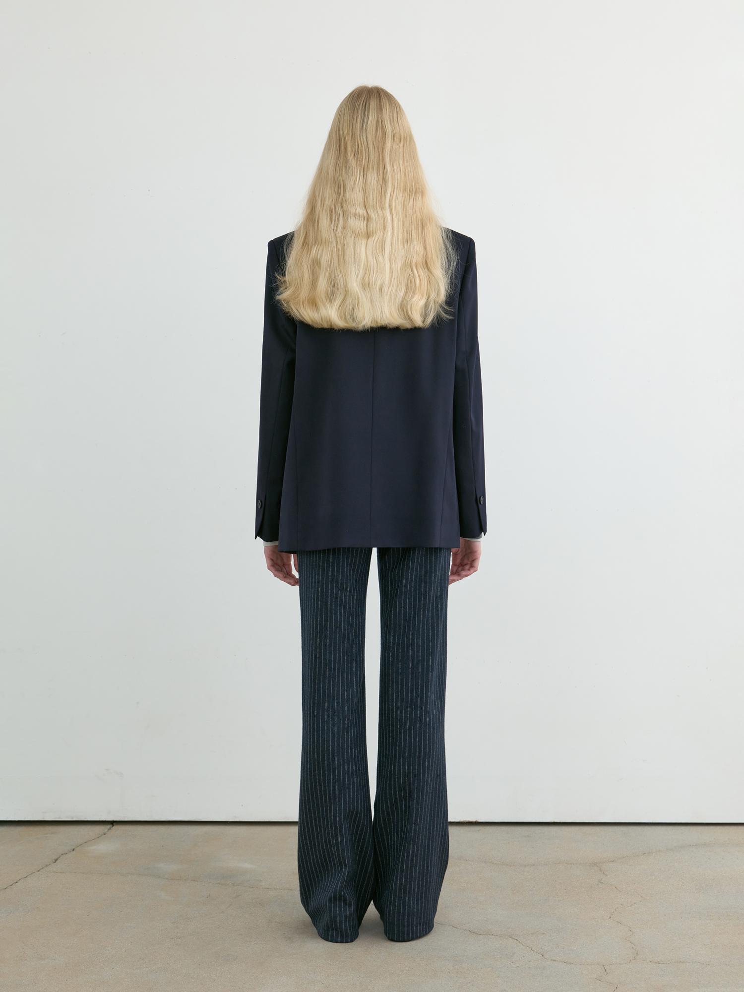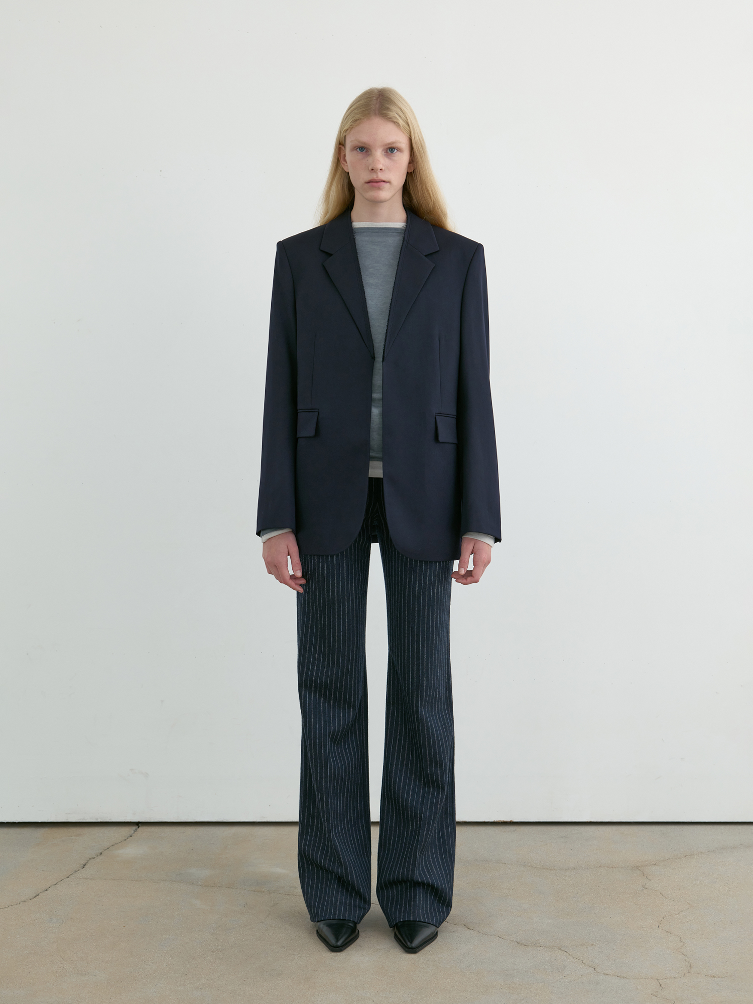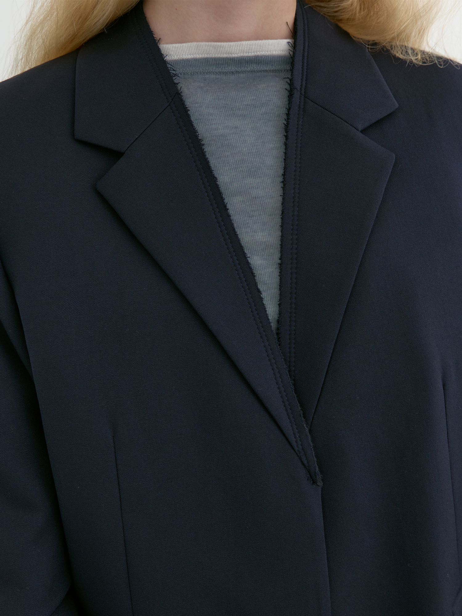 [6th Restock] 일본 타키사다 나고야의 소모 울 원단으로 제작된 네이비 자켓입니다. 깊이 있는 컬러감과 네크 커팅 디테일이 균형을 이루며, 힙을 덮는 기장과 여유로운 사이즈로 편안하게 착용할 수 있습니다. 버튼을 배제한 미니멀한 디자인에 이탈리아산 보강재를 사용해 부드럽게 처리했으며, 꼼꼼하고 완성도 있게 마감되었습니다. |