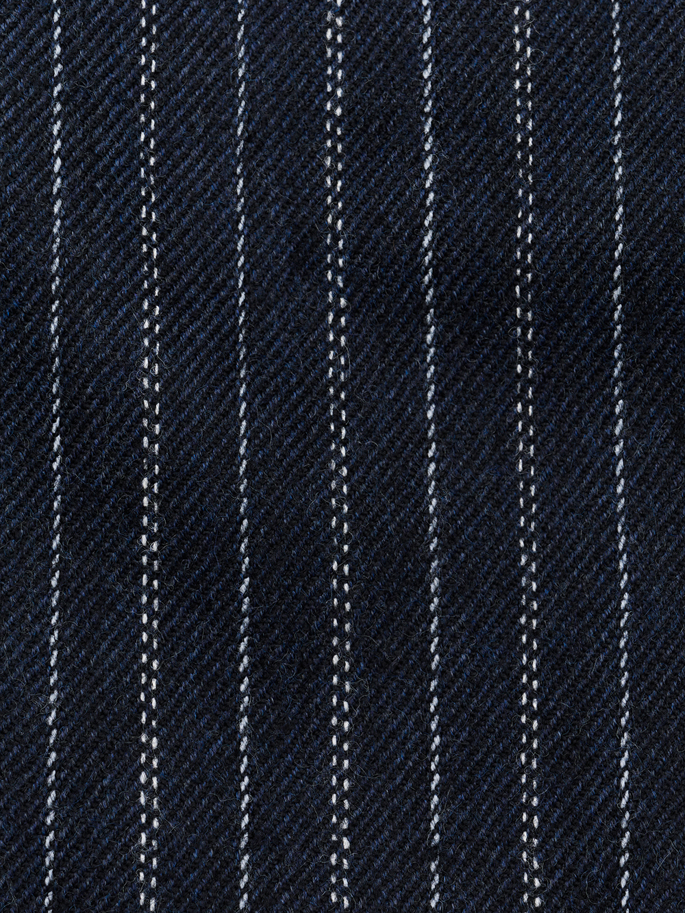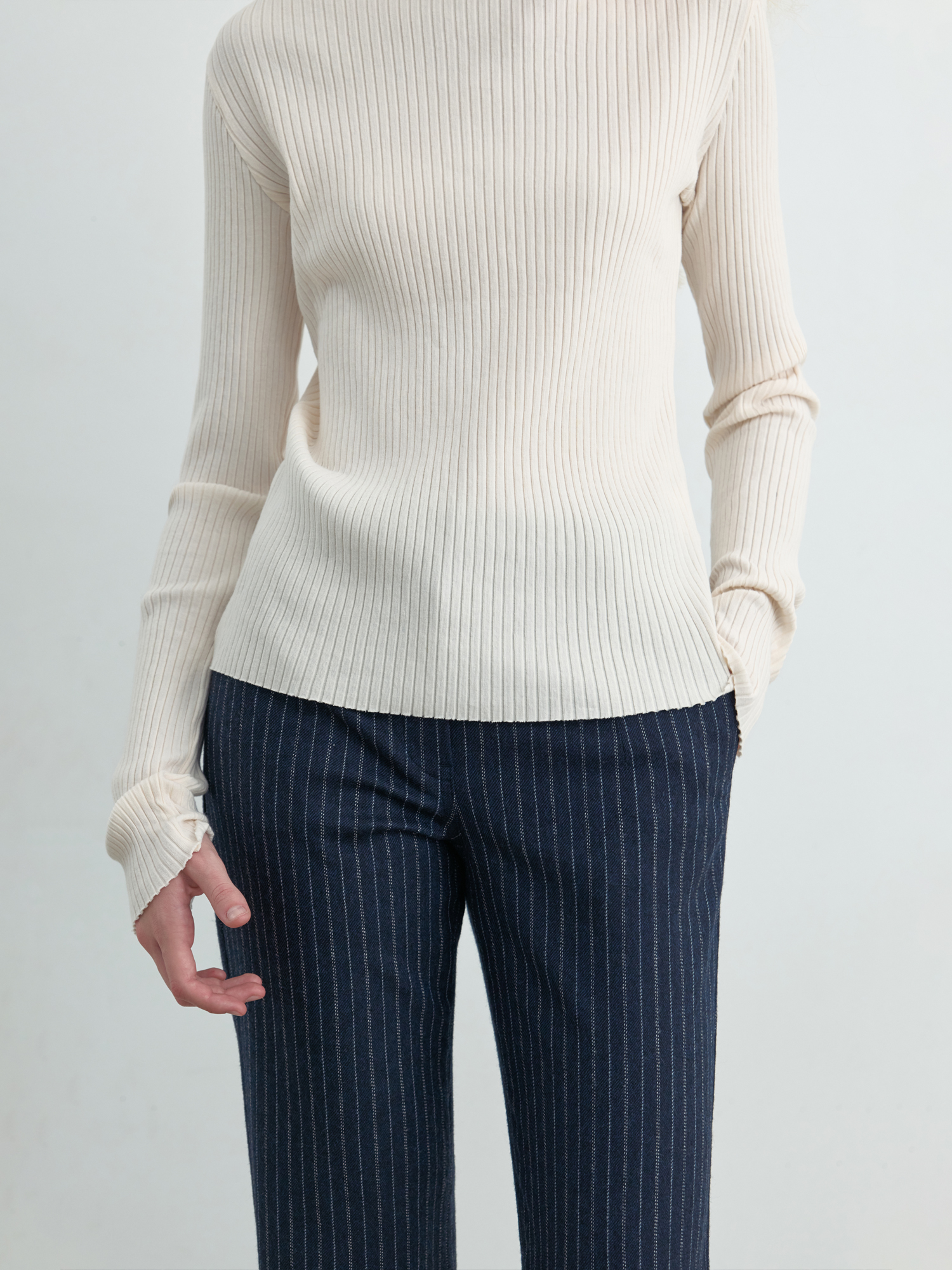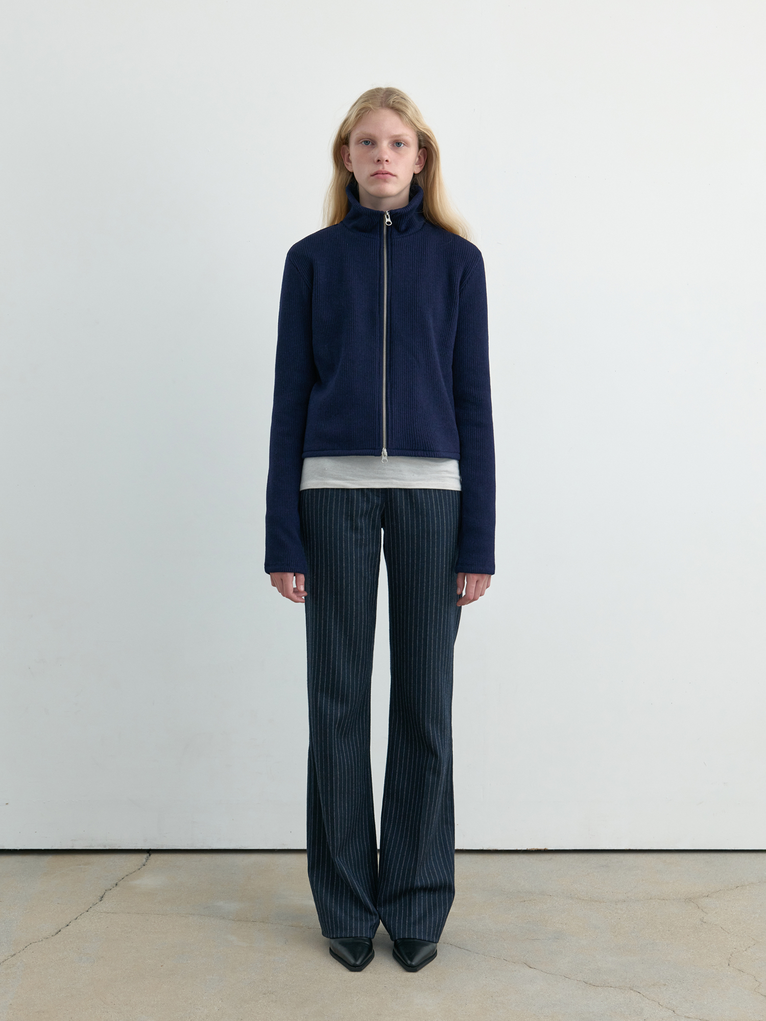 딥 네이비 스트라이프의 클래식 울 슬랙스입니다. 겨울 울 소재 특유의 포근한 질감과 슬림하게 흐르는 세미 부츠 실루엣이 자연스럽게 균형을 잡아줍니다. 허리 라인은 얇고 정돈되게 구성했으며, 과하지 않은 스트라이프 폭이 조용하게 존재감을 남깁니다. |